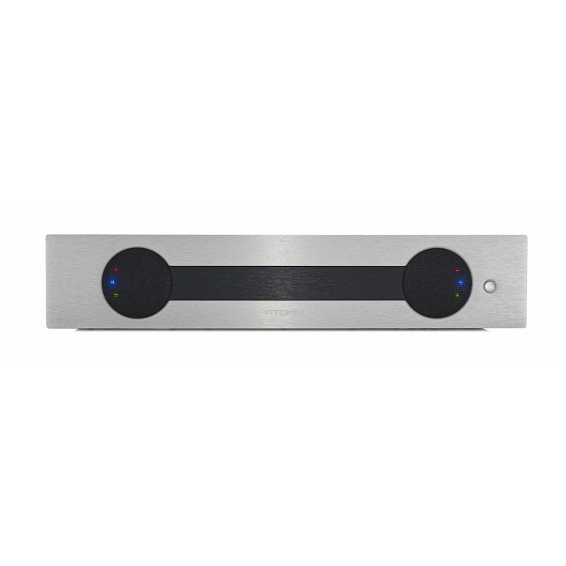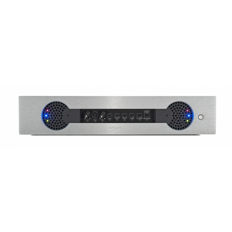 Le châssis en aluminium brossé affiche des dimensions compactes de 450 x 88 x 348 mm pour un poids de 8,7 kg. La face avant est ornée de deux grilles circulaires perforées de part et d'autre d'une rangée de commandes et d'indicateurs LED. Deux diodes bleues indiquent la mise sous tension, deux diodes rouges l'activation des protections U-Guard et T-Guard, et deux diodes vertes l'intervention du contrôle d'excursion X-Guard. Tous les réglages sont accessibles directement en façade pour un ajustement rapide selon les besoins d'écoute. Deux ventilateurs à faible vitesse tournant à 2 500 tours par minute se déclenchent dès que la dissipation thermique atteint environ 2 x 40 watts continus à 22 °C. Leur niveau sonore limité préserve le silence de fond dans les installations domestiques.
