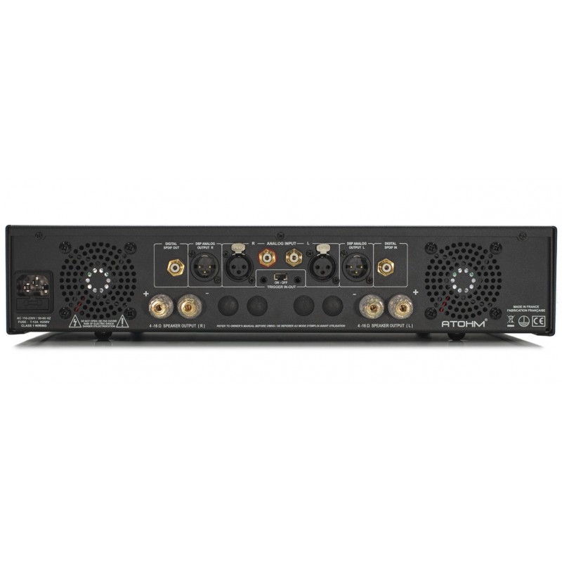 La face arrière propose des entrées commutables RCA et XLR sur récepteurs différentiels INA, avec une impédance de 21 kΩ en RCA et de 18 kΩ par branche en XLR. Le niveau d'entrée maximal atteint +22 dBu. Un chaînage numérique S/PDIF via des connecteurs RCA de 75 ohms permet de connecter plusieurs unités en cascade tout en préservant la qualité du signal. Une entrée trigger 12 V sur jack 3,5 mm autorise le pilotage par des sources compatibles, tandis qu'une sortie trigger permet de réveiller d'autres appareils. Quatre sorties haut-parleurs acceptent des charges de 4 à 16 ohms nominaux, avec une tolérance allant jusqu'à 3 ohms sur les courbes d'impédance.