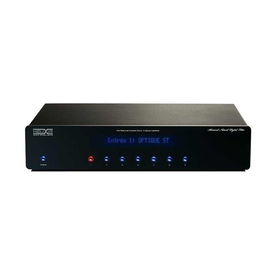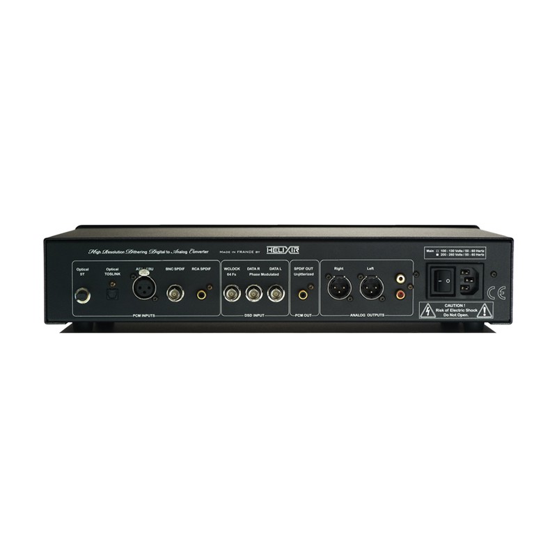 Le méthacrylate noir est la marque distinctive des produits Helixir. Le HRDDAC n'y fait pas exception, arborant une façade noire du plus bel effet, illuminée par l'afficheur bleu et les entourages des boutons de commande. La face arrière est équipée de connectiques pour affronter tous les standards numériques du marché actuel, avec des entrées qui permettront de relier tout type d'appareil, ainsi que des sorties analogiques symétriques et asymétriques. Les trois entrées BNC sont destinées à connecter le module optionnel USB2 ProAudio. La fabrication est bien entendu très rationnelle, faisant appel à des cartes de haute qualité, une sélection de composants très haut de gamme et une disposition pensée dans les plus infimes détails.