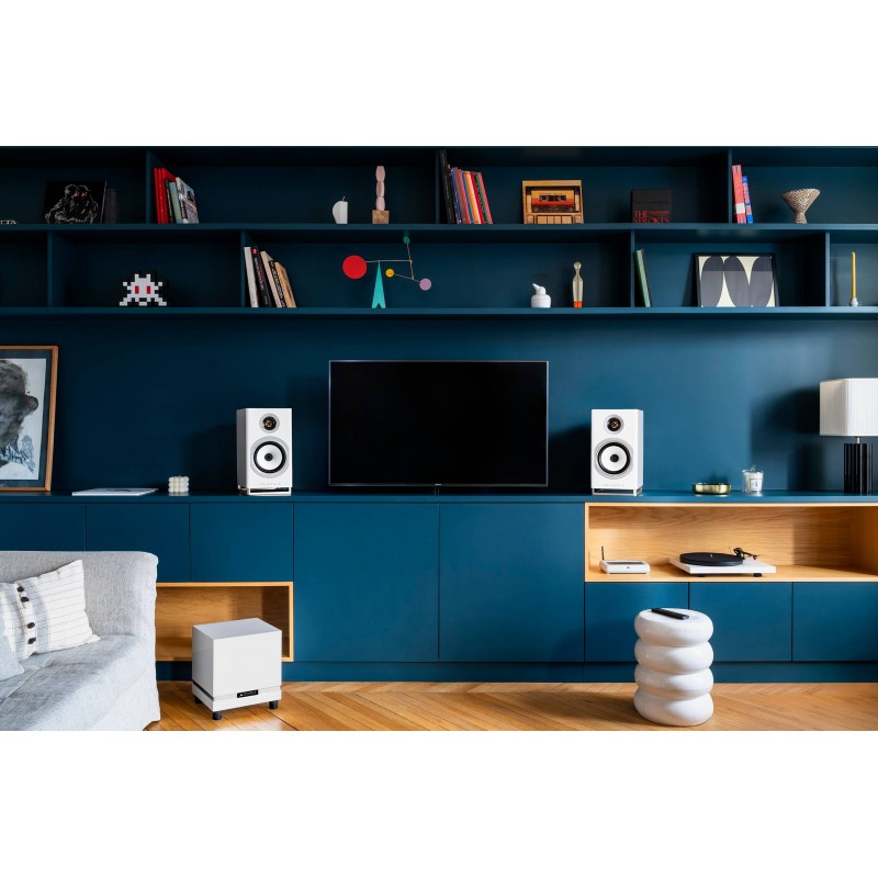 Chaque enceinte déploie une puissance de 100 watts grâce à une bi-amplification en classe D, avec un circuit dédié pour chacun des haut-parleurs. Cette configuration permet un contrôle rigoureux du signal audio et optimise la réponse de chaque transducteur. Le processeur numérique DSP intégré affine en permanence les caractéristiques des haut-parleurs, garantissant ainsi des performances exceptionnelles pour un système de cette taille. La charge bass-reflex à évent orienté vers le sol diffuse les basses fréquences de manière homogène dans la pièce, préservant ainsi la clarté du registre médium.