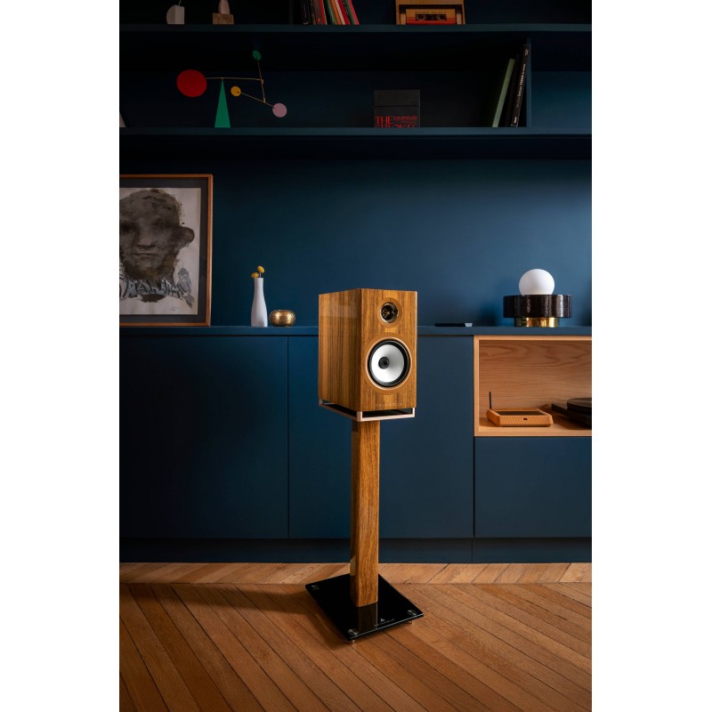 Le tweeter à pavillon TZ2530MG assure une diffusion homogène sur toute la zone d'écoute. Son dôme de 25 mm en alliage de magnésium et d'aluminium offre une extension dans les aigus harmonieuse et dénuée d'agressivité. Le haut-parleur médium-grave de 165 mm utilise une membrane propriétaire en pulpe de cellulose 100 % naturelle, sans traitement additionnel, pour une reproduction neutre, notamment des voix. Sa suspension à demi-rouleau, composée d'un assemblage de mousse et de caoutchouc traité, offre une large ouverture dynamique et un grave généreux. La structure interne s'appuie sur le système propriétaire DVAS (Driver Vibration Absorption System) qui réduit considérablement les vibrations parasites de l'ébénisterie. Les formes incurvées du coffret, associées au relief structuré des joncs en silicone, optimisent la diffraction des ondes sonores et contribuent à la pureté de la restitution. Cette bande passante s'étend de 40 Hz à 22 kHz.