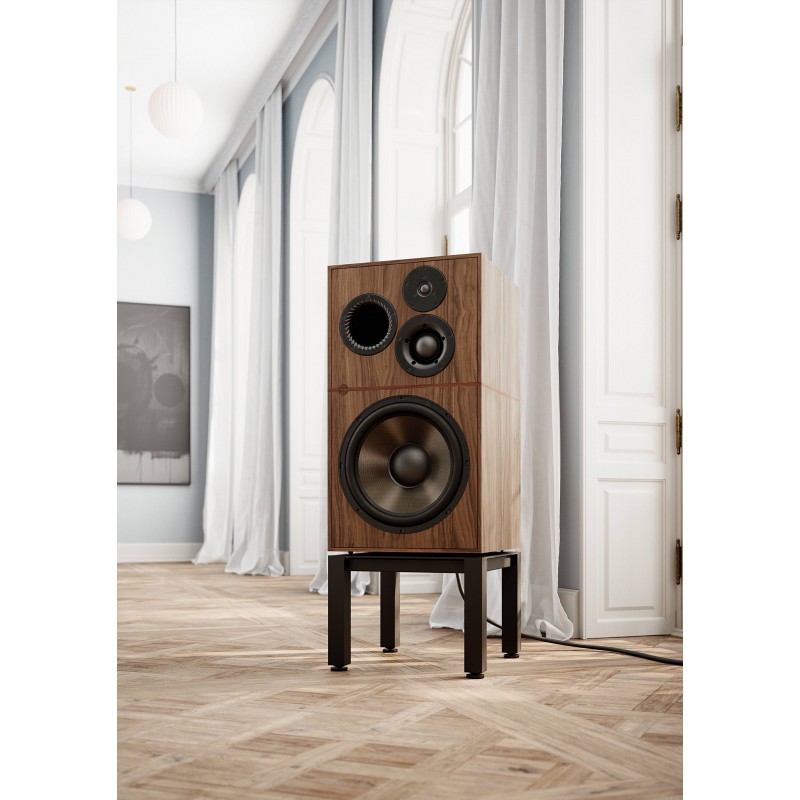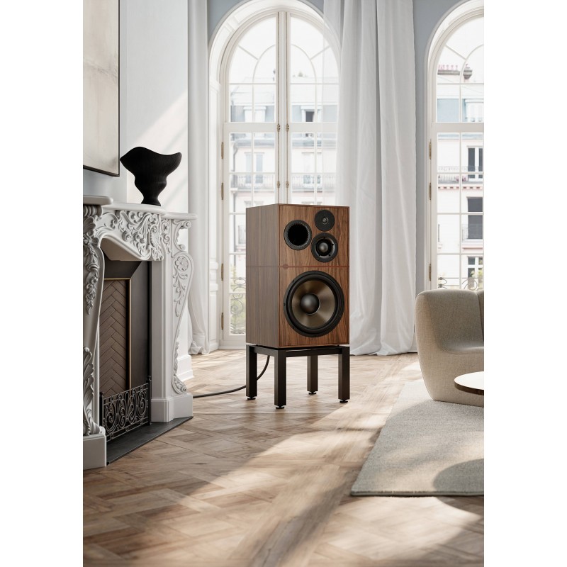 Fidèle à l'esthétique distinctive de Revival Audio, l'Atalante 7 Evo allie avec brio tradition et modernité dans une élégance souveraine qui défie le temps. Disponible avec un placage en bois véritable de noyer ou d'ébène sélectionné avec le plus grand soin, chaque enceinte se présente comme un véritable objet d'art qui s'intégrera parfaitement dans les intérieurs les plus exigeants. Le liseré finement gravé du logo et les détails soigneusement travaillés soulignent son caractère premium. Ses dimensions généreuses (820 x 456 x 480 mm) et son poids conséquent de 67 kg par enceinte témoignent non seulement de la robustesse exceptionnelle du produit, mais aussi de la qualité supérieure des matériaux utilisés. Les pieds métalliques avec un système sophistiqué de découplage par pointes sont fournis avec les enceintes. Ils offrent non seulement une stabilité optimale indispensable à la reproduction sonore de haute précision, mais contribuent également à l'élégance générale du design, renforçant la présence majestueuse de ces enceintes dans votre espace d'écoute.